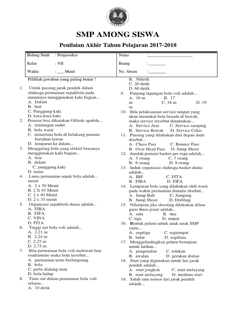 Oct 06, 2018 · soal pas pjok smp kelas 7 ini sebagai persiapan bagi kalian yang akan menghadapi penilaian akhir semester 1 dan bisa di download secara gratis. Penilaian tengah semester pts 1 tahun pelajaran 2021/2022 sebentar lagi akan dilaksanakan. May 07, 2021 · soal penjas kelas 7. Materi mata pelajaran pjok pada semester 1 kelas 7 antara lain mempelajari olah raga sepakbola, kasti, bola basket, atletik seperti lari jarak pendek maupun dekat dan bagaimana melakukan pertolongan pertama pada kecelakaan (p3k). Menendang menggunakan kaki bagian luar